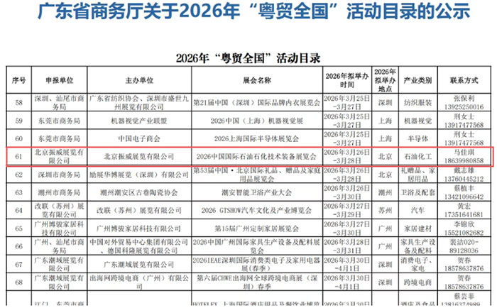 春启新程,拓市正当时!近日,广东省商务厅正式发布《广东省商务厅关于2026年“粤贸全国”活动目录的公示》,明确公布了2026年度“粤贸全国”系列国内线下展会名录,中国国际石油石化技术装备展览会(cippe2026北京石油展)凭借深厚的行业积淀、国际化的平台实力与突出的赋能价值,成功入围。成为助力广东石油石化及相关产业企业开拓市场、提升核心竞争力的重要载体,也为展会自身的高质量发展注入强劲政策动力。